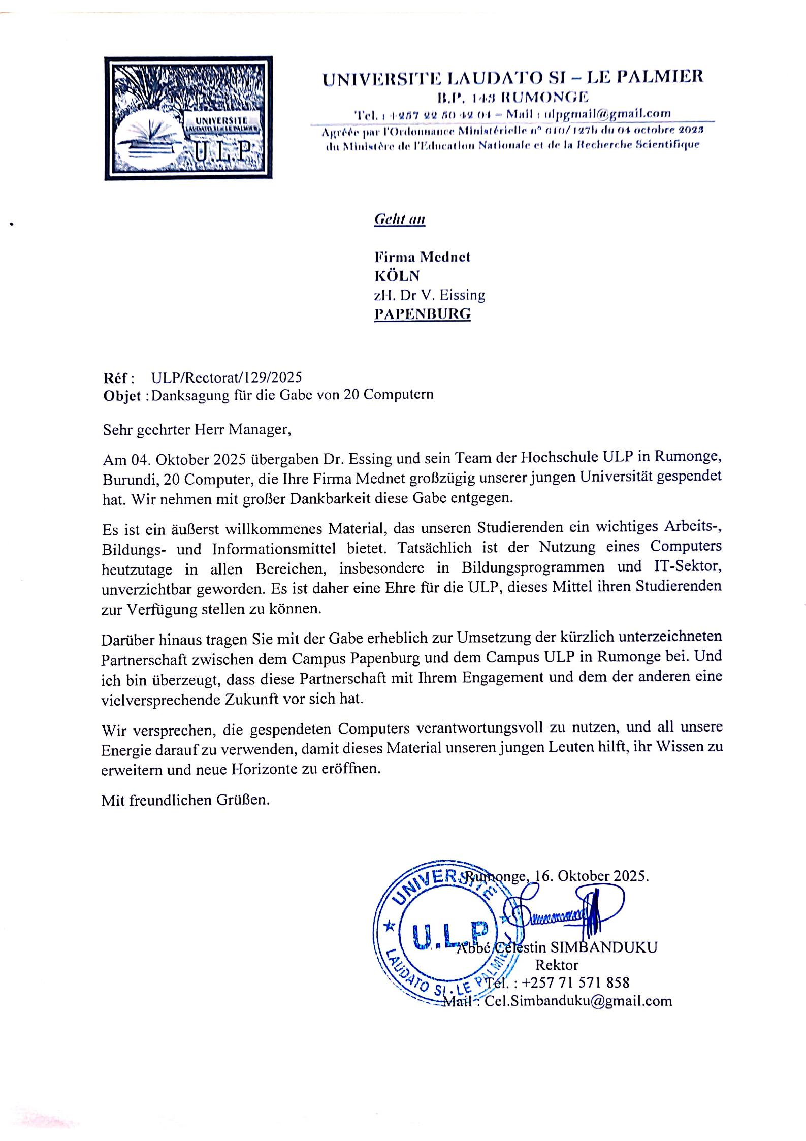Dafür übersandte uns der Rektor der Universität ein Dankesschreiben, was uns sehr erfreut hat.